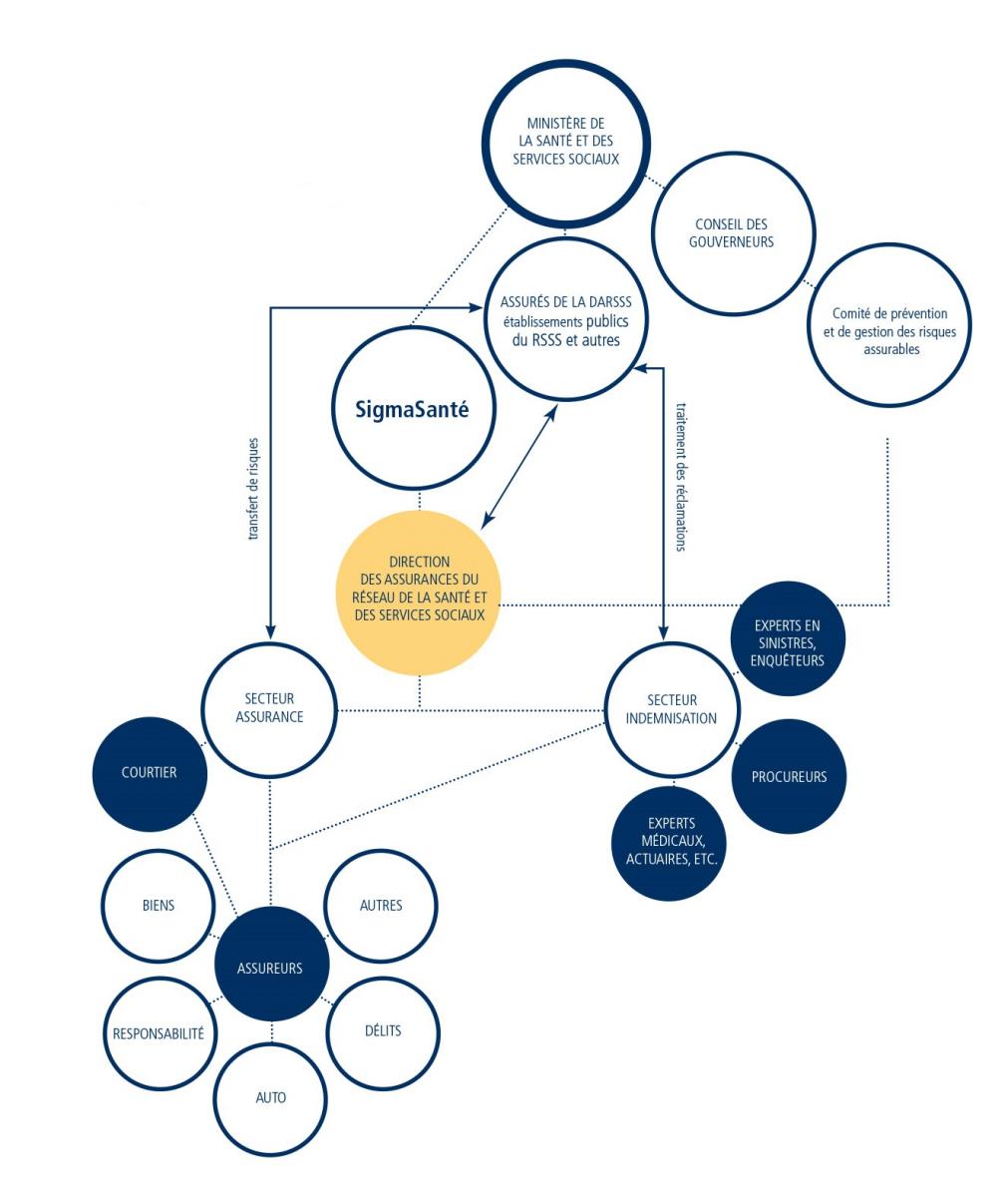 La DARSSS accomplit sa mission en lien avec les établissements publics du RSSS, le MSSS et selon sa structure de gouvernance. Les assureurs qui acceptent un certain transfert de risques en contrepartie d’une prime complètent la dynamique de l’organisation.